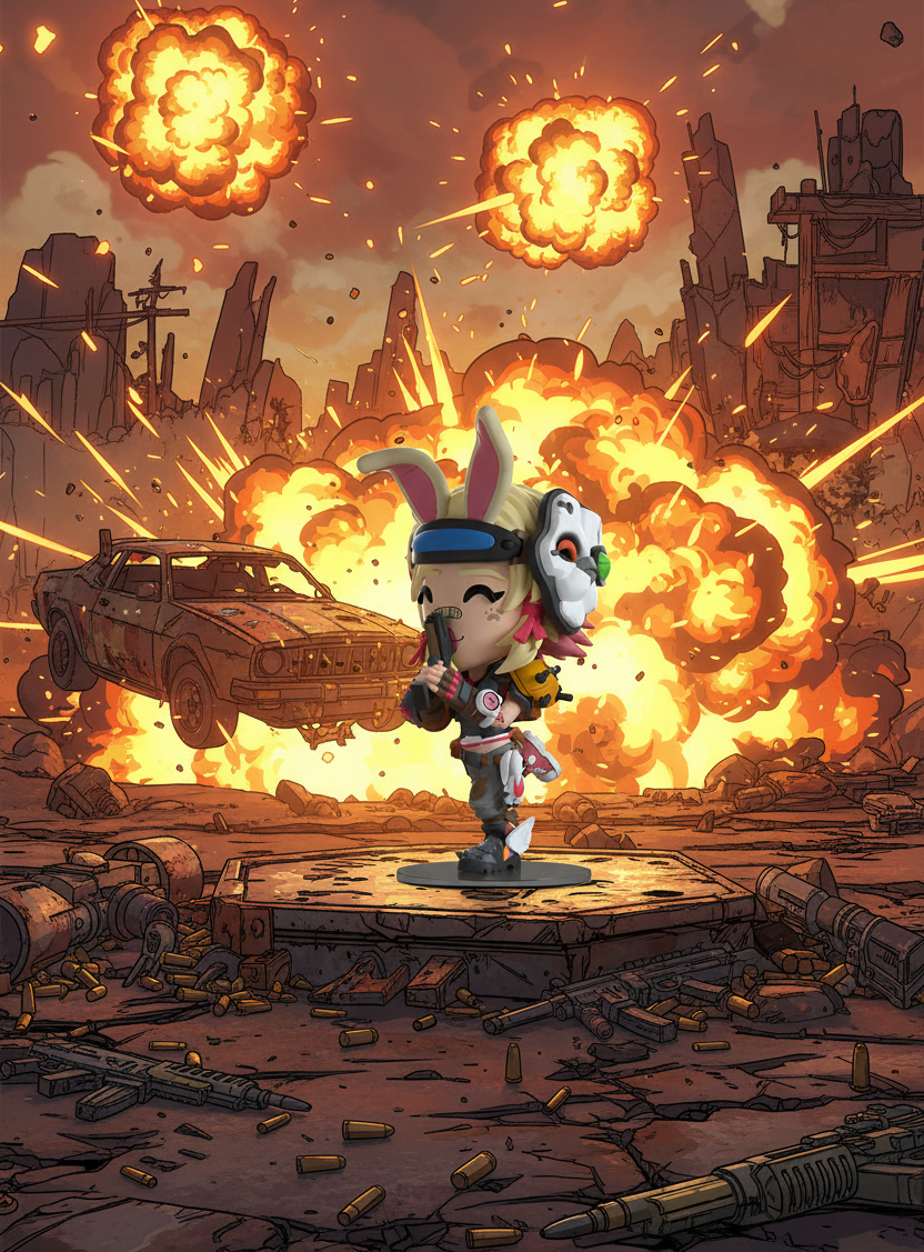 Tina vous a cordialement invité à ses débuts sur Youtooz ! Avec de longues oreilles de lapin tombant vers l'avant sous la visière qui entoure ses cheveux blonds aux pointes roses, un masque de lapin blanc réassemblé se trouve sur le côté de sa tête. Mesurant 5,4 pouces et posée debout sur un pied tandis que l'autre est levé derrière elle, elle tient joyeusement un pistolet vers le haut devant ses lèvres roses et son visage souriant bandé ! Toujours attachée et prête à l'action, elle est couverte d'un mélange d'armures, de munitions et de gadgets par-dessus son haut noir, son pantalon à motifs et ses chaussures dépareillées. L’extérieur de son emballage vous place au goûter de Tina avec des biscuits et des tasses échevelées sur un fond rose sauvage, tandis que l’intérieur est d’un gris foncé orné du logo répétitif du coffre-fort. L'emballage de protection montre Tina posée devant un logo de coffre-fort éclaboussé sur un fond jaune et gris tandis que sa silhouette est visible à travers la grande fenêtre transparente située à l'avant. Cet objet de collection est livré dans une pochette extérieure de protection mate en relief et un protecteur en plastique de taille personnalisée pour une protection maximale pendant l'expédition. Cet objet de collection a été conçu en collaboration avec @therealracckun.