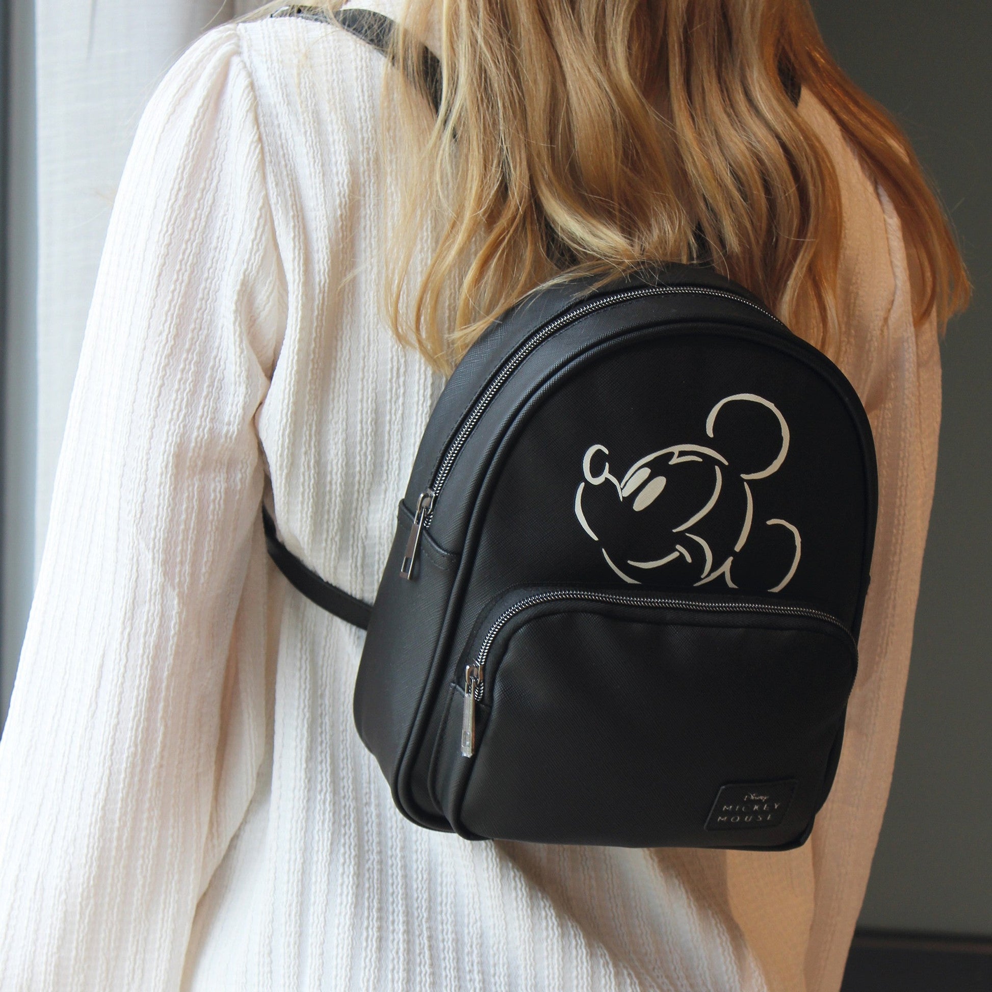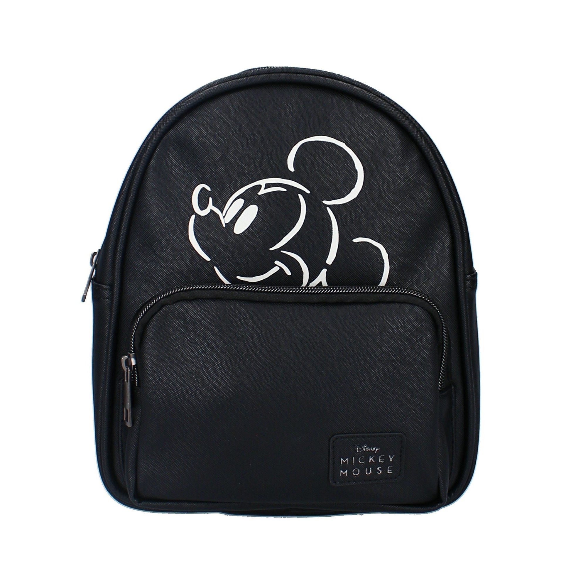 - This Mickey Mouse backpack from the "Sweet About Me" collection is a perfect item for anyone who loves this cartoon character. Mickey Mouse's cool head is depicted in large size, making this bag a real eye-catcher. The bag is made of black PU leather and the zipper is also decorated with black details. The shoulder straps of the bag are adjustable in length. In addition, the bag has a main compartment that offers space for some items.
