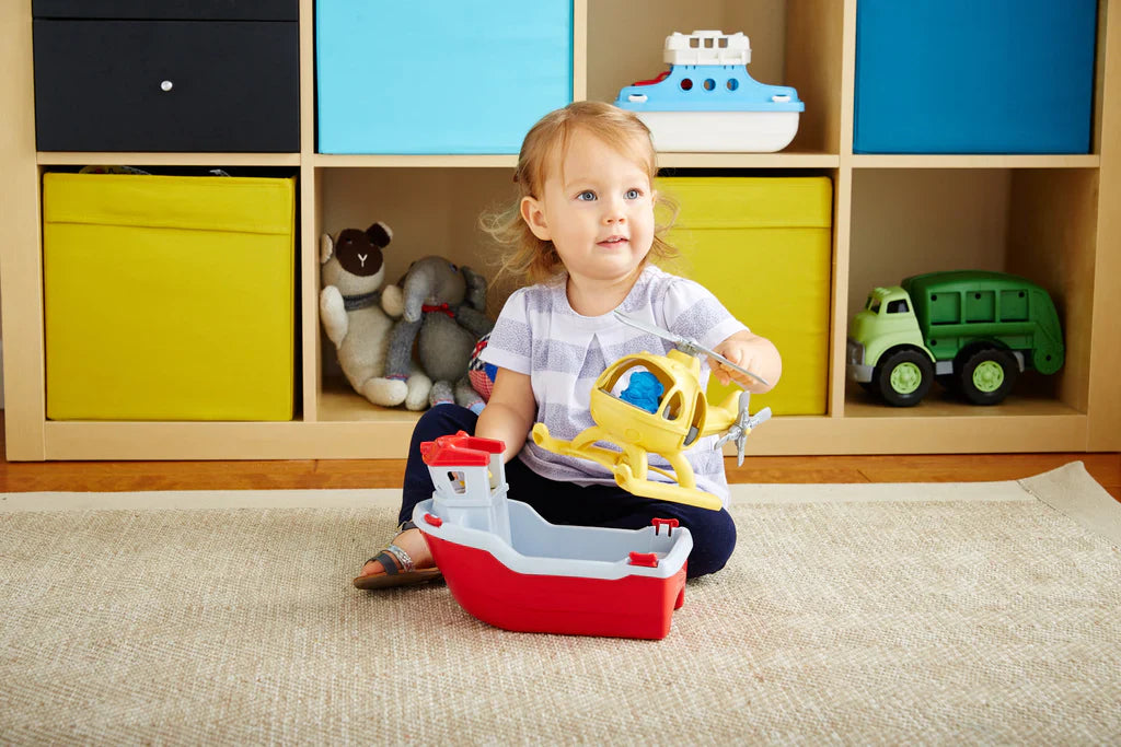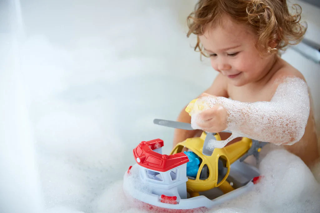 No water rescue is out of reach when the Green Toys™ Rescue Boat and Helicopter get the call! This two-in-one toy is just as fun on land as it is in the water, with a bright yellow life-size helicopter nestled on the back deck of the red and white lifeboat. The set also includes two characters – a Captain Duck and a Pilot Bear – ready to go wherever your child's imagination takes them. Specially designed to float in water and open for the dishwasher, this vessel is a perfect addition to any bathtub fleet.