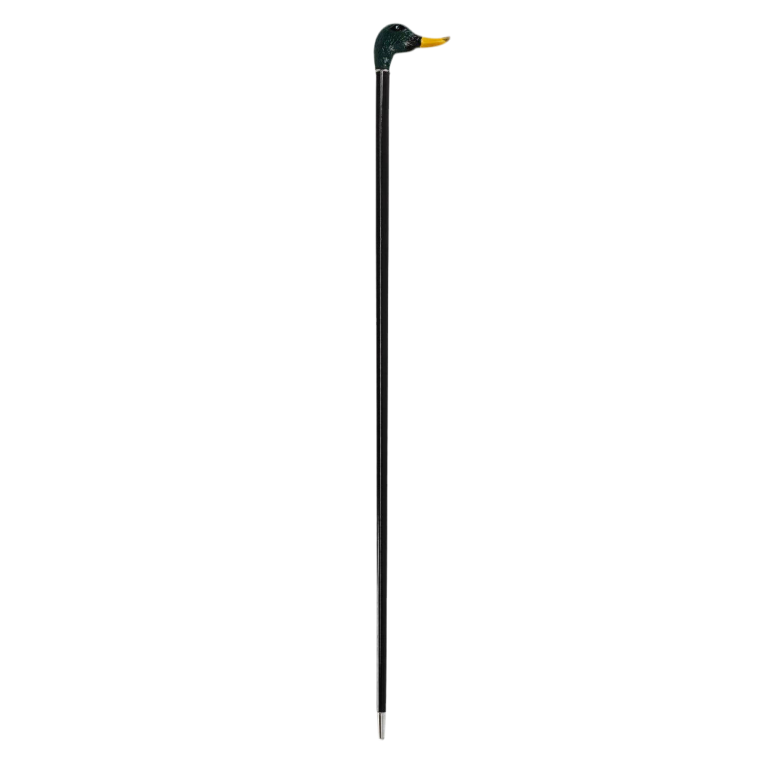 Elegant walking stick with a hand-carved and hand-painted duck on the handle. The original ceremonial walking stick offers a contemporary interpretation of British elegance. Ideal for modern dandies and lovers of masculine elegance who wish to express a refined and whimsical taste. The distinctive accessory to wear for formal and informal ceremonies, weddings, fashion shows, galas, or any important event, allowing you to stand out from the crowd. These handcrafted walking sticks are authentic artistic masterpieces to wear and collect. Brought together in various forms, they become precious ornaments that tastefully decorate refined environments and stately homes. Each DIY stick can be customized to your style. Dimensions: post height 94 cm. Materials: Hand-decorated handle. Polished black lacquered beechwood structure. Silver-plated metal end cap and neck.