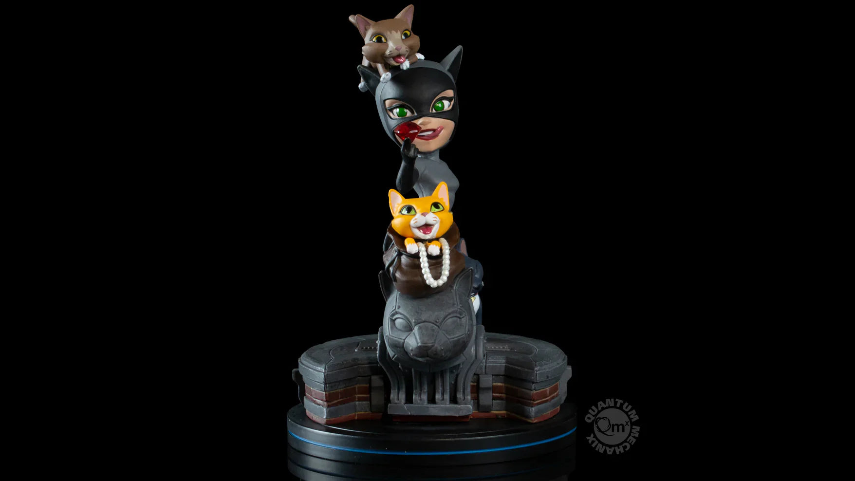 Inspired by her appearance in Batman: The Animated Series, the Catwoman Q-Fig Elite features Selina Kyle accompanied by her true loves: a pack of friendly felines and a massive gemstone freed from a local collector. We sculpted Catwoman to perfectly capture her mischievous misdeeds, as well as rendering a high level of detail in her costume, the kittens, and the gargoyle she stands on.