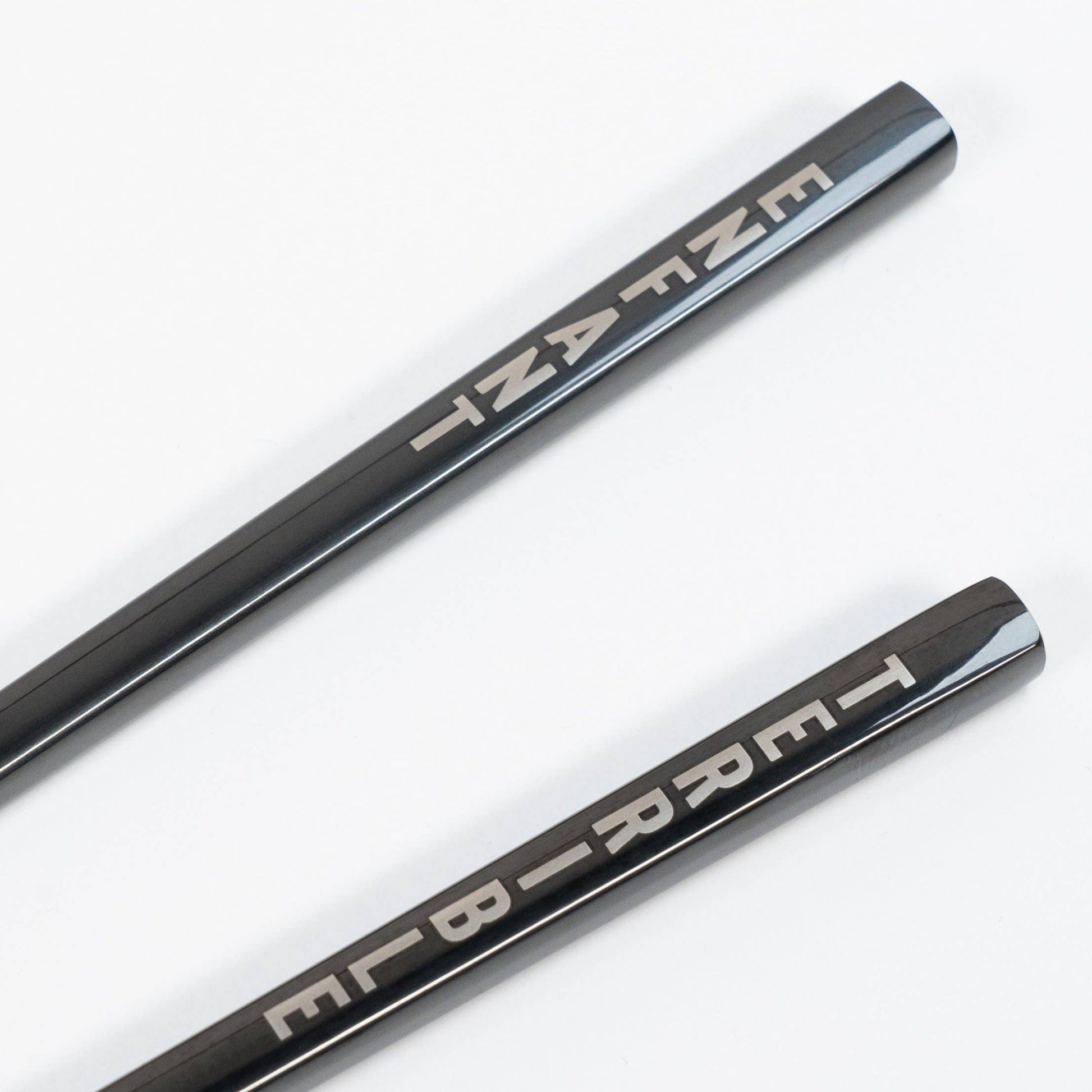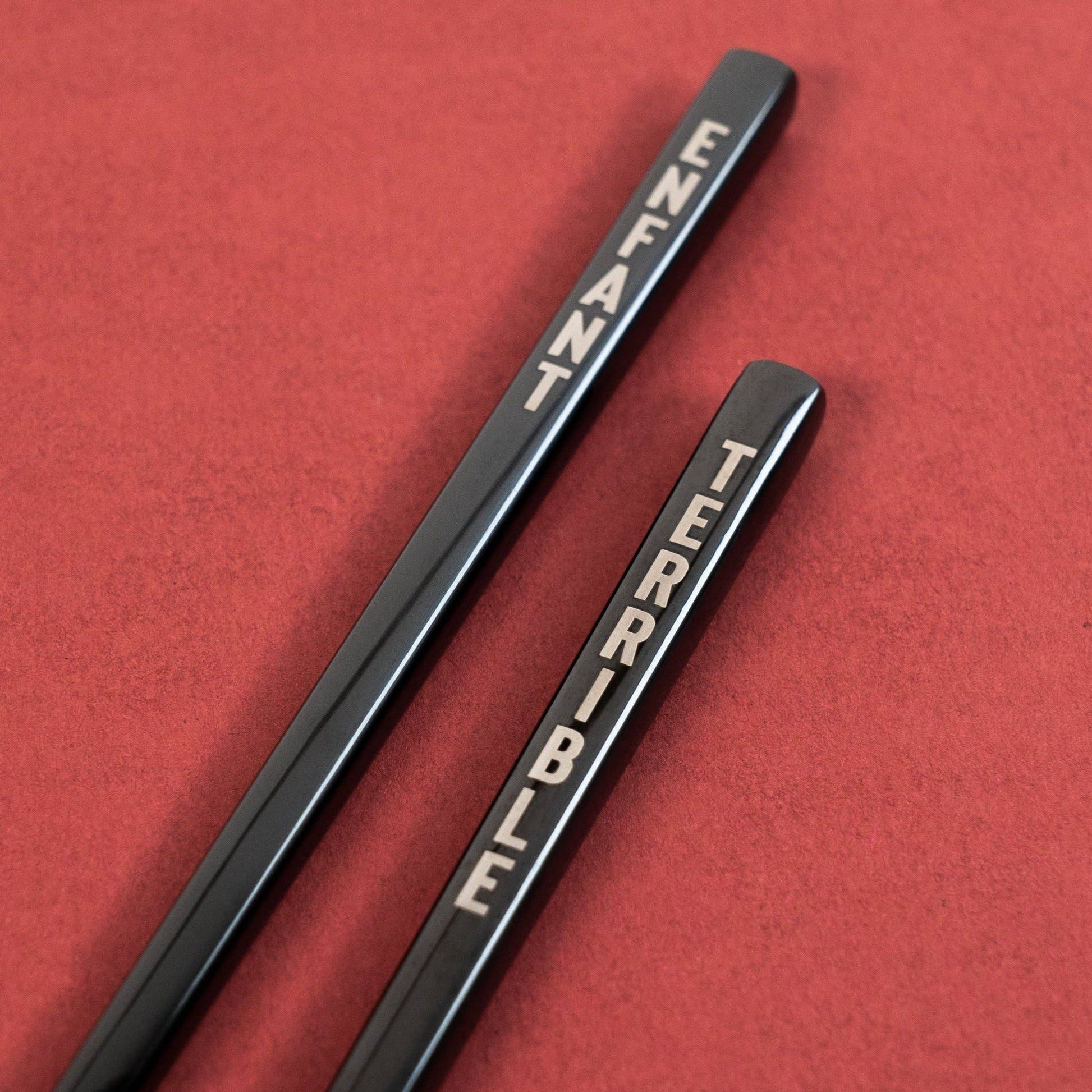 Asian chopsticks in stainless steel. Laser engraving. Personalization "ENFANT TERRIBLE". Ideal for daily personal use or to offer as a gift. The essential accessory for lovers of Asian cuisine. Easy to clean, by hand or in the dishwasher. Made in France. Description: Asian chopsticks Engraving: Laser Color: Black Size: 23 cm Weight: 20g Material: 100% stainless steel