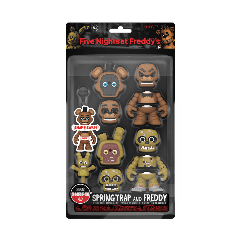 Survive the Night at Freddy Fazbear's in the blink of an eye! Get closer to this 2-pack of Springtrap and Freddy Fazbear in Funko SNAPS! collectibles. SNAPS! Springtrap and SNAPS! Freddy Fazbear features six different pieces that each snap together, including a head, two interchangeable faces, a torso, legs and an accessory.