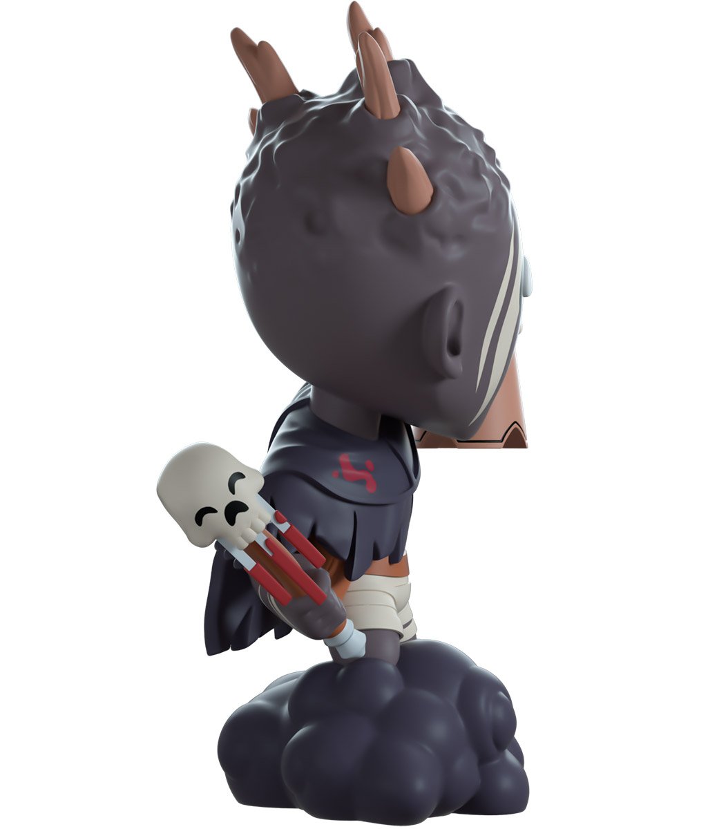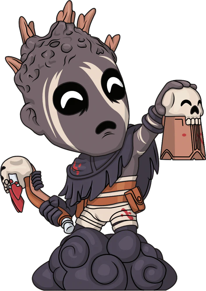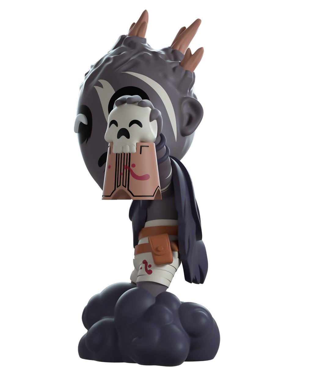 The Wraith makes a stealthy entrance by floating into Youtooz! Standing 12.5cm tall, he holds a brown and white skull bell in his left hand, while his right hand is curled back, ready to strike fearsomely with a bloody axe. With sharp brown wood emerging from a gnarled and twisted grey head, white streaks crawl across his macabre face with deep black eyes full of despair. The short, tattered cape he wears draped over his shoulders covers a bandaged body bound with brown belts, while his legs disappear into the swirling mass of smoke at his base. Out of his packaging, the Wraith has set his sights on you as he floats through a wooded clearing. While the interior is a black silhouetted forest with glowing red and blue mist and the white "Dead by Daylight" logo on the back, this sinister design then continues onto the protective sleeve with dark trees completely surrounding it while the figure can be seen through the large clear window on the front. This collectible comes in a protective matte, embossed outer sleeve and a custom-sized plastic protector for maximum protection during shipping. @therealracckun.