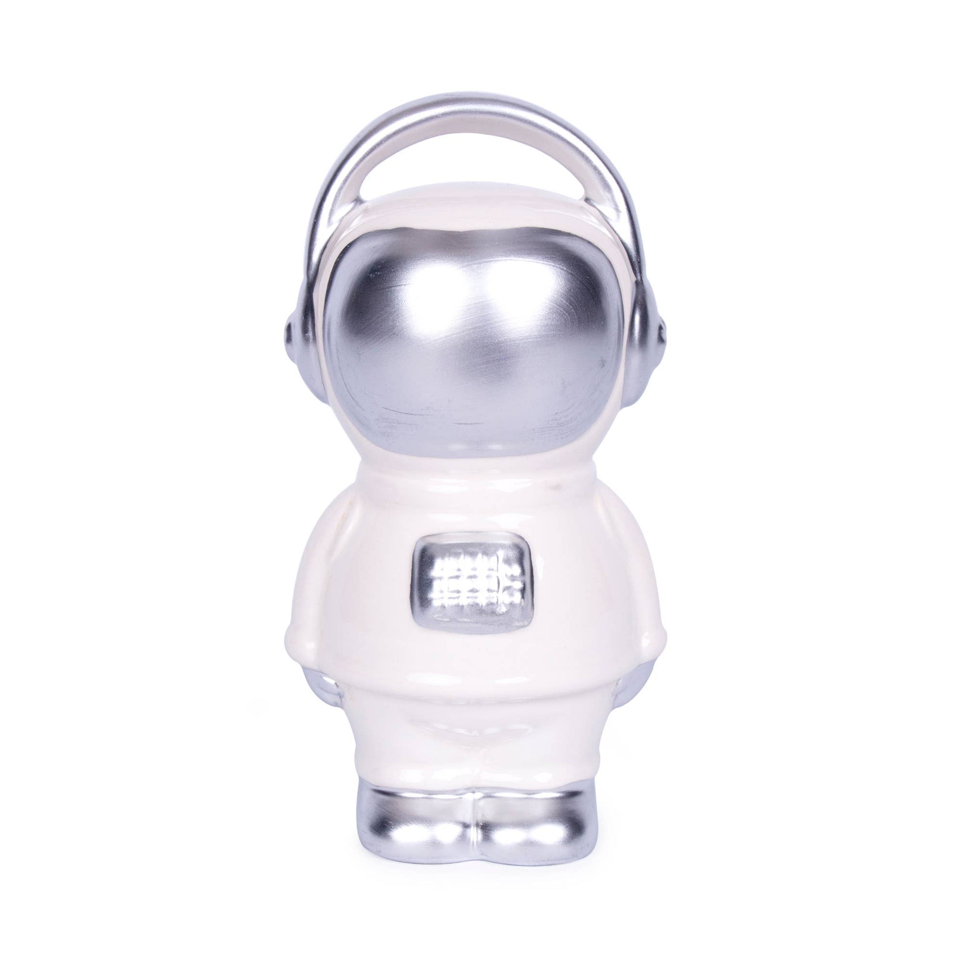 Tirelire astronaute. Elle a une fente à l'arrière du casque spatial et un couvercle dans la partie inférieure de la figurine qui permet d'extraire les pièces.