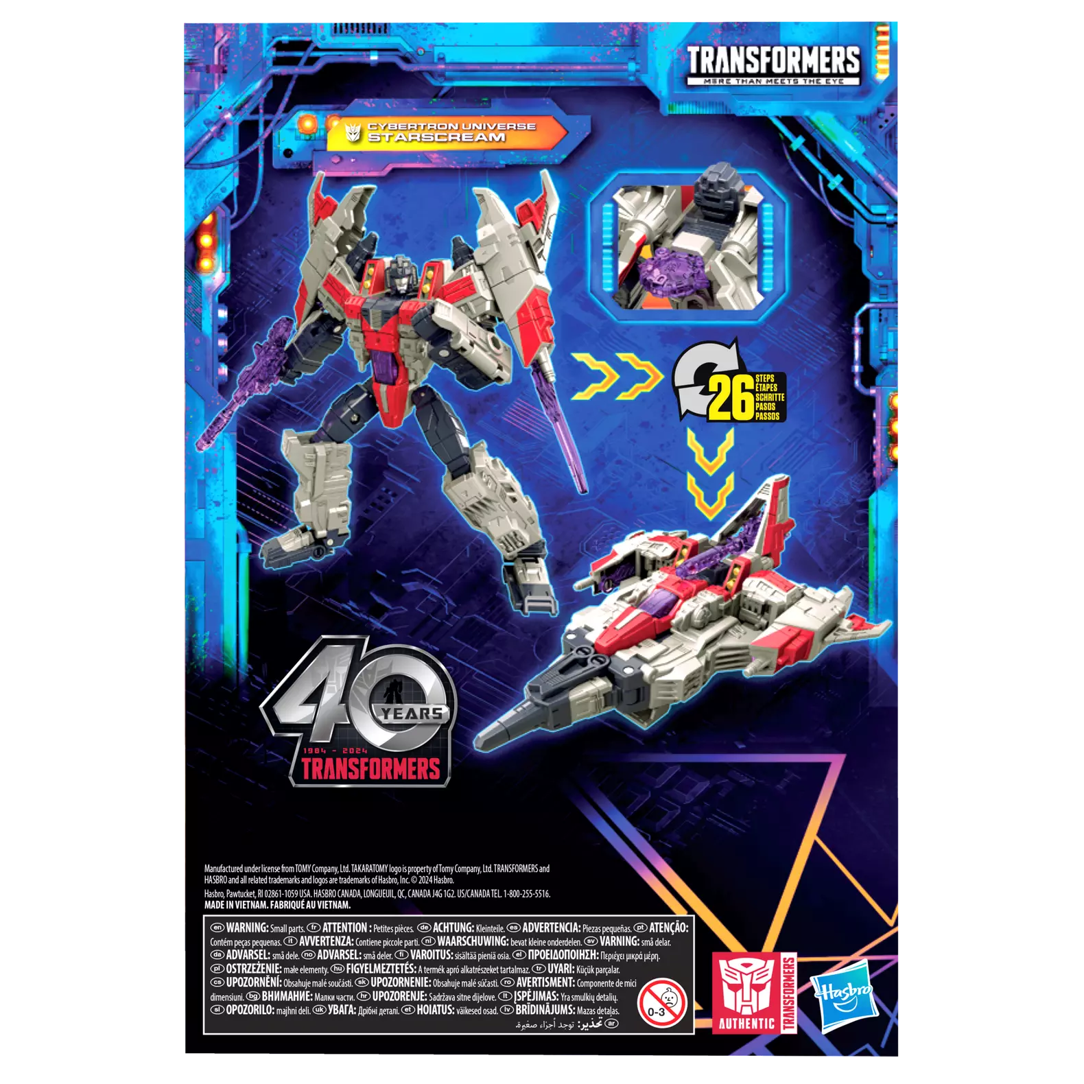 Collect your favorite Transformers robot characters and build a collection with the Transformers Legacy United line and this Voyager Class Cybertron Universe Starscream figure! This 6.9-inch-scale Cybertron Universe Starscream figure converts from robot to jet mode in 26 steps. Equip the figure with the included blaster, jet wing accessories, and Cyber Key in both modes. This Cybertron Universe Starscream figure is inspired by the character from the Transformers: Cybertron animated series and features articulated head, arms, and legs for dynamic posing. The Transformers Generations Legacy line celebrates 40 years of Transformers history. Transformers Legacy opens the door to a new universe that's stronger than meets the eye, where all generations of Transformers come together like never before. This line allows you to collect and combine different characters to create the perfect selection of Legacy figures.