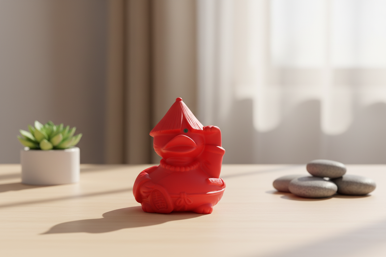 - 🐱 Gelukbrengend ontwerp : Deze eend heeft het ontwerp van de Maneki Neko, met een opgeheven poot om geluk uit te nodigen en een vrolijke glimlach, die optimisme en voorspoed symboliseert.