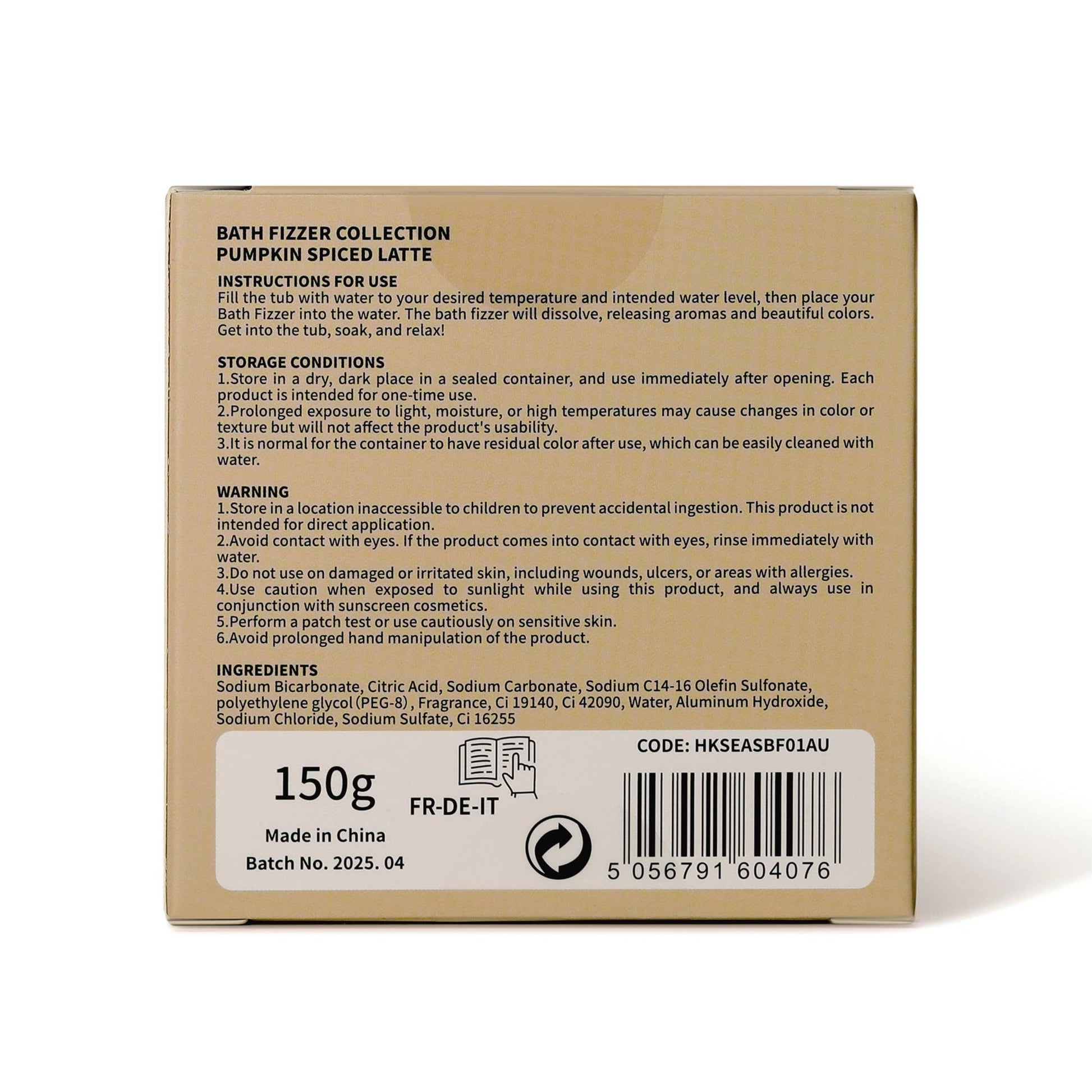 Badbom (150 g) Geurpercentage: 0,8% Afmetingen: Doosgrootte: 60*90*88 mm 1 badbom per verpakking Geurnaam: Spiced Pumpkin Latte. Kleur: Bruin