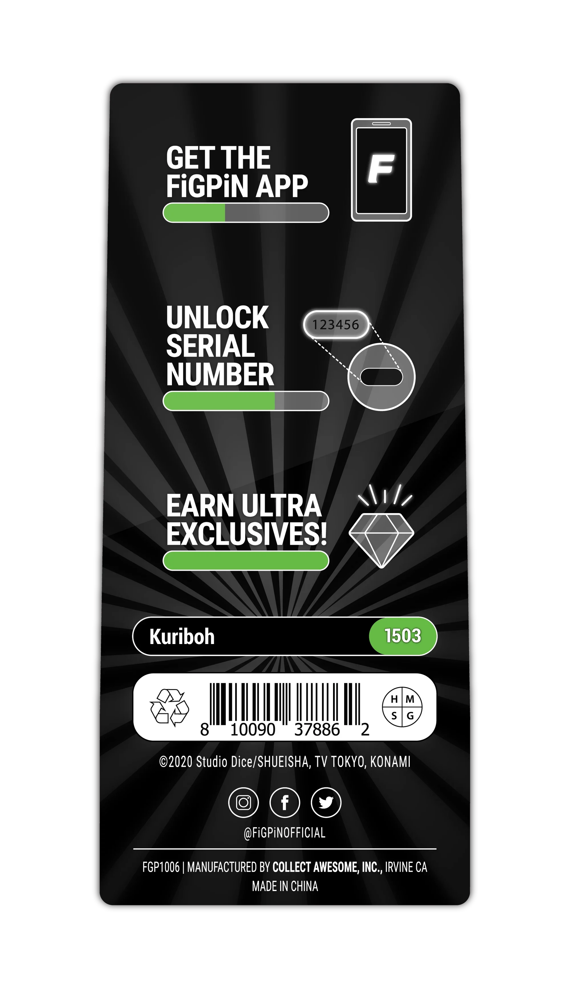 Collectionnez génial. Partagez et affichez vos FiGPiNS n'importe où et à tout moment grâce à nos supports d'épingles innovants et à nos vitrines de qualité musée. FiGPiNS peut être affiché comme votre silhouette la plus convoitée ou porté comme votre accessoire préféré. Épinglez-les sur votre sac ou veste préféré, ou affichez-les simplement sur votre bureau. Peu importe où vous les placez, vous serez sûr de vous démarquer ! Chaque FiGPiN est fabriqué en alliage de zinc moulé incrusté d'émail dur et est fini avec un revêtement en nickel électrolytique. Tous les FiGPiNS comprennent un numéro de série alphanumérique unique gravé au dos, ce qui rend chacun d'entre eux unique. Avec l'application FiGPiN, vous pouvez déverrouiller le numéro de série pour découvrir la rareté de votre FiGPiN et commencer à gagner des points en tant que fier propriétaire d'un superbe FiGPiN. Disponible dès maintenant pour les appareils Android et iOS !