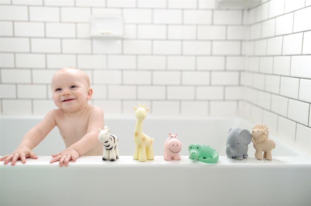Jouets de bain en caoutchouc naturel et anneaux de dentition.