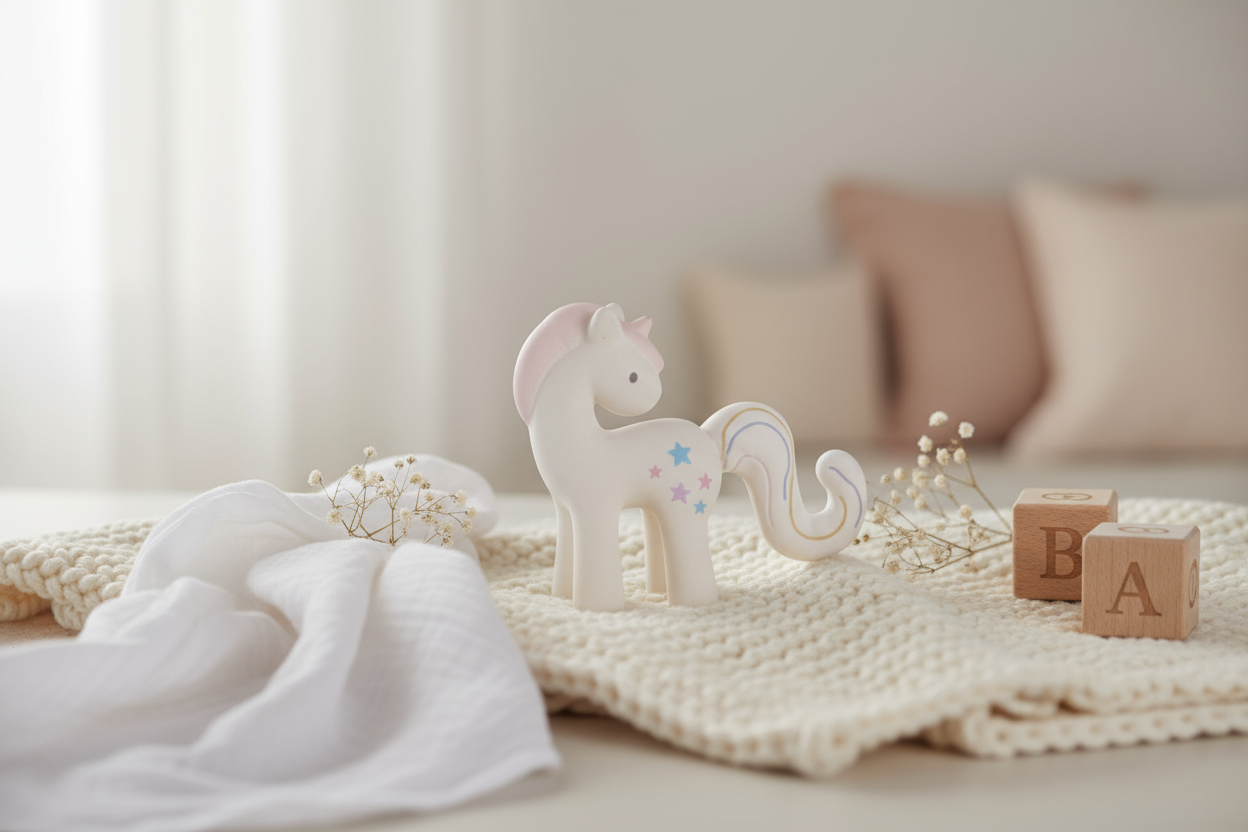 Tikiri Contes de Fées: LICORNE Barbe à Papa 13cm, en caoutchouc naturel et coton, en boîte fenêtre, 0+