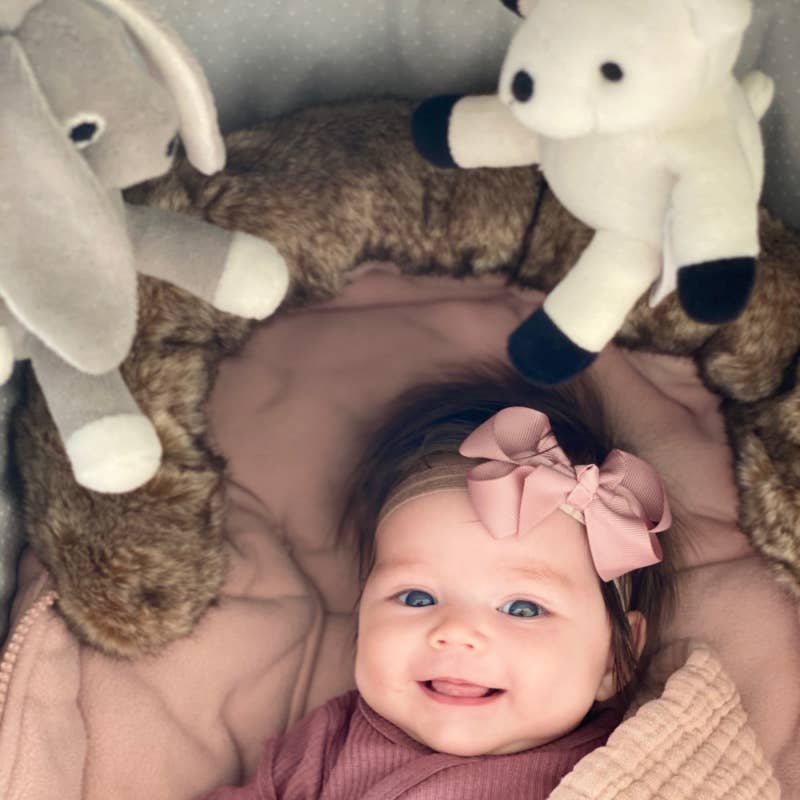 La remorque pour poussette est fabriquée à partir de coton biologique certifié, à la fois le tissu extérieur et le rembourrage. À l'intérieur de l'animal, il y a un hochet avec un léger hochet.