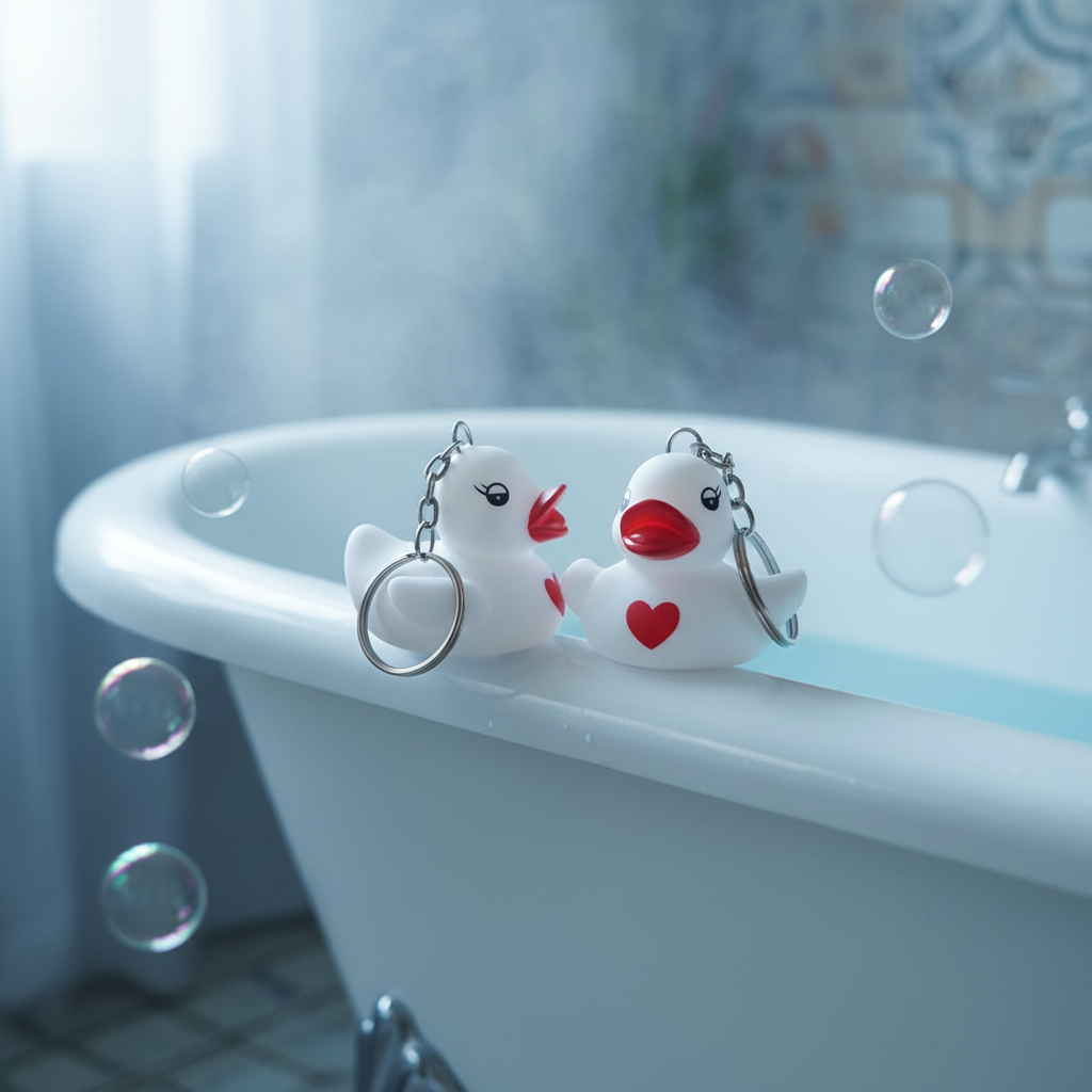 Porte-clefs canard de bain blanc avec un coeur rouge